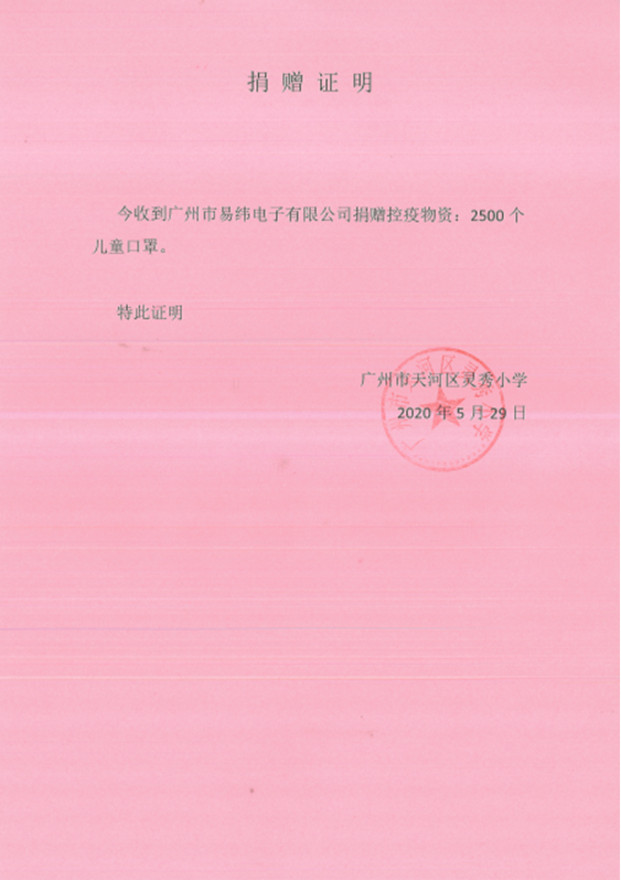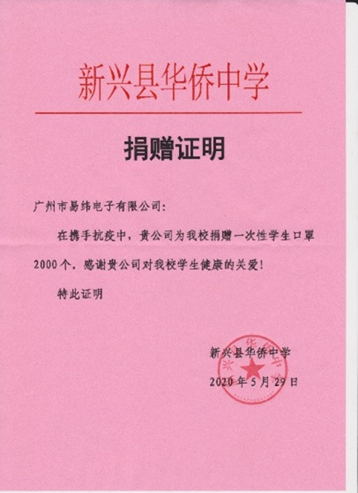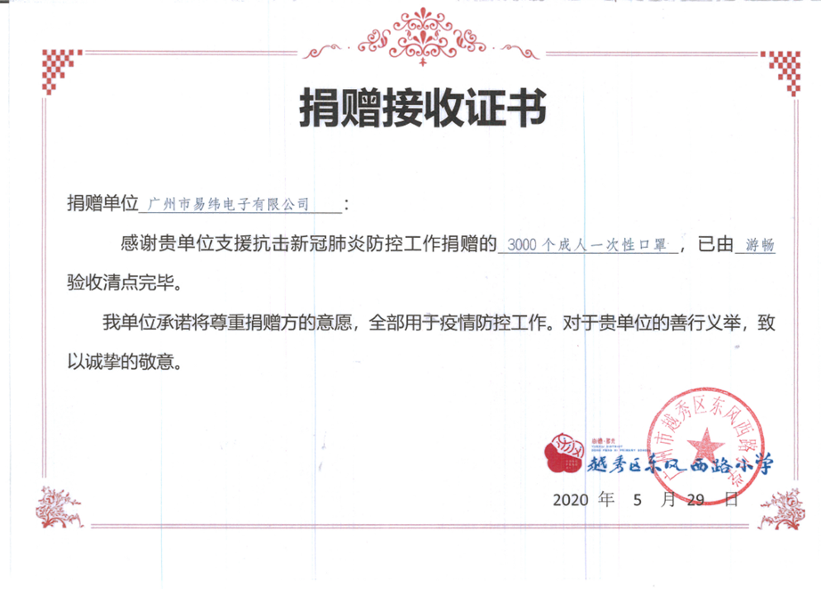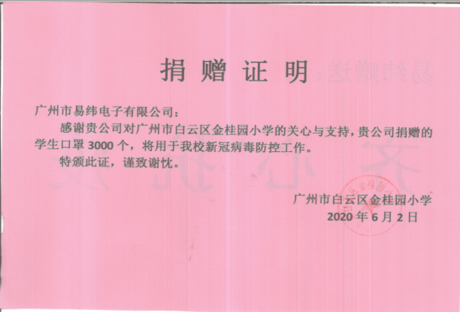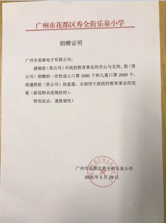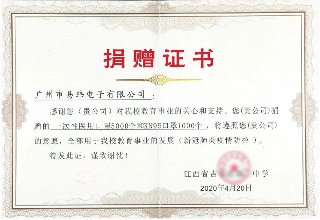 尽管广州易纬同样面临各种困难,公司还是超出了年度计划,参与了多项爱心慈善活动,这是爱;除了口罩,还向多所学校捐赠了实物、现金,去做力所能及的公益,帮助身边的人共渡难关,希望在2020年关爱到更多的人,点燃更多人的希望。