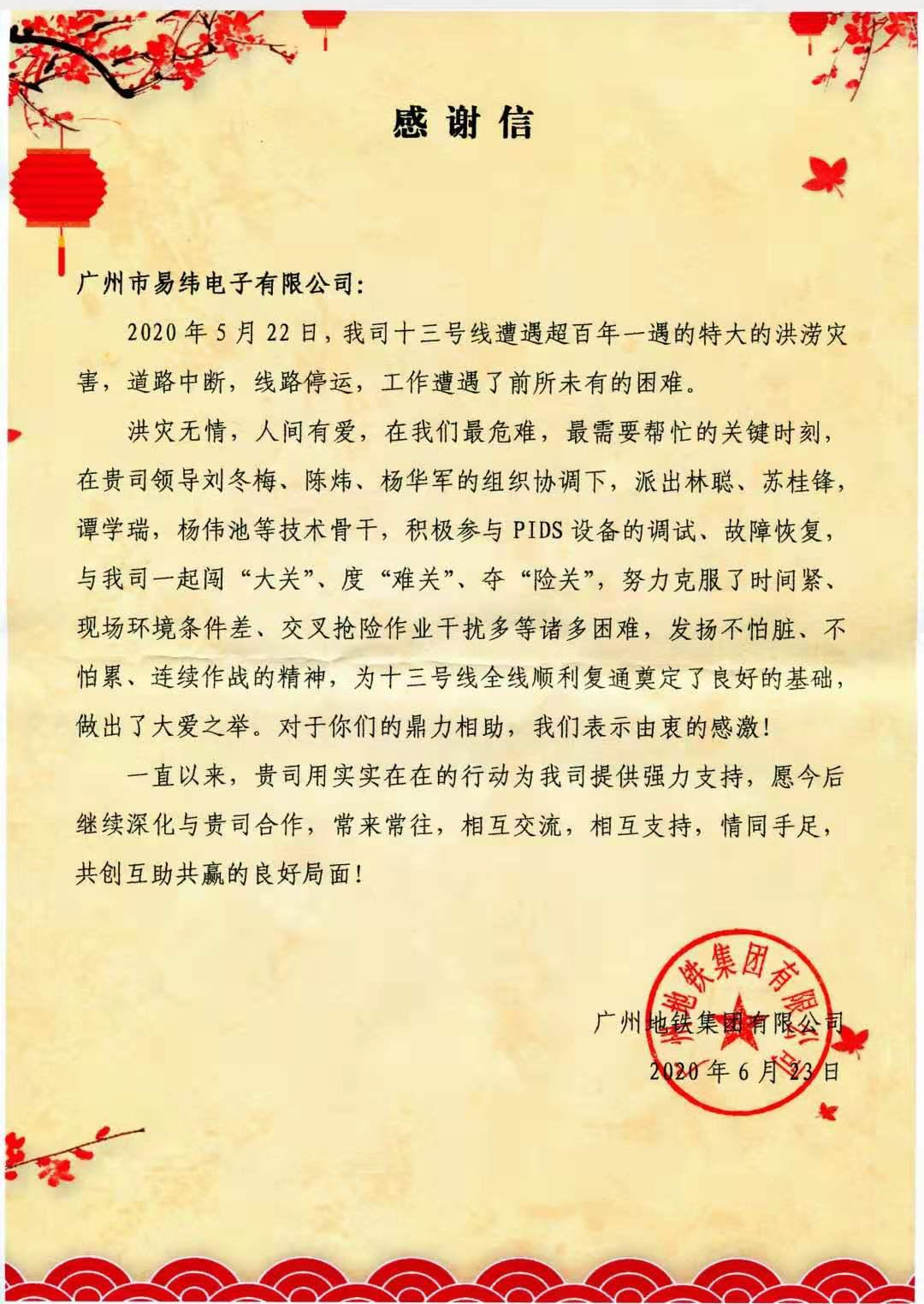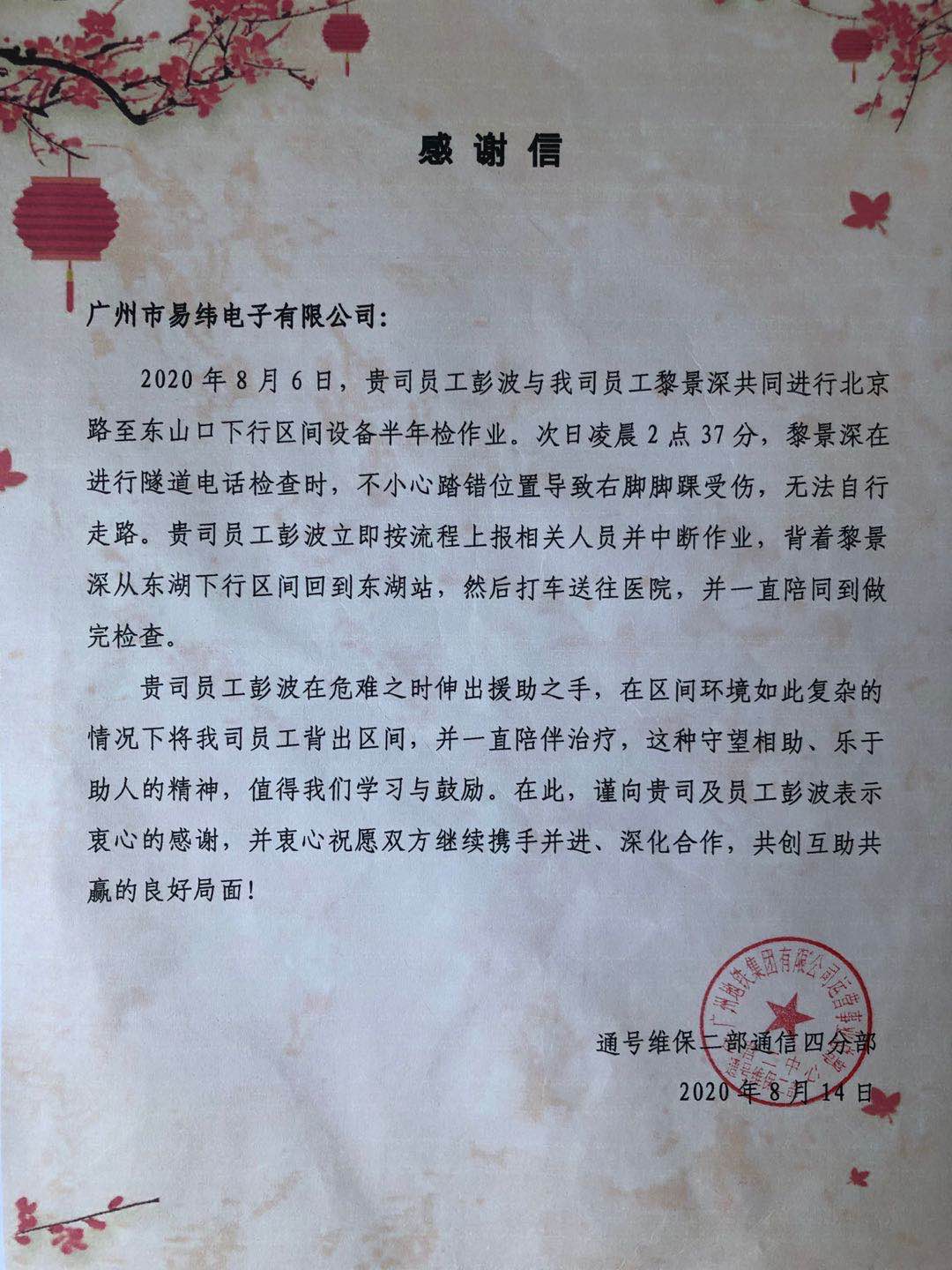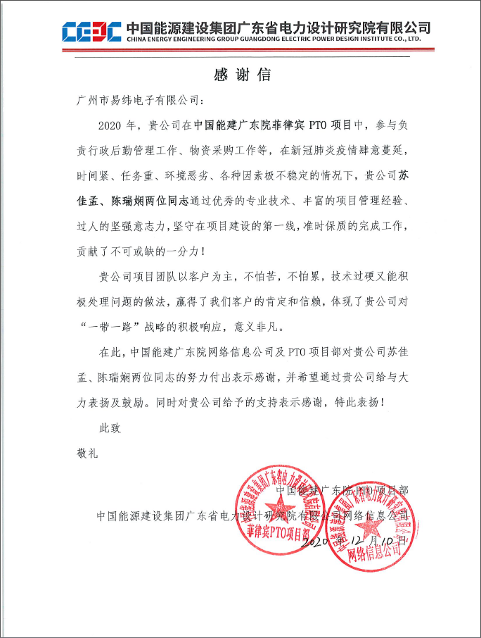 而且广州易纬在海外工作的同事更是坚守在一线,遵守对客户的承诺,就像客户在感谢信里所说:“贵公司项目团队以客户为主,不怕苦,不怕累,技术过硬又能积极处理问题的做法,赢得了我们客户的肯定和信赖,体现了贵公司对“一带一路”战略的积极响应,意义非凡。”