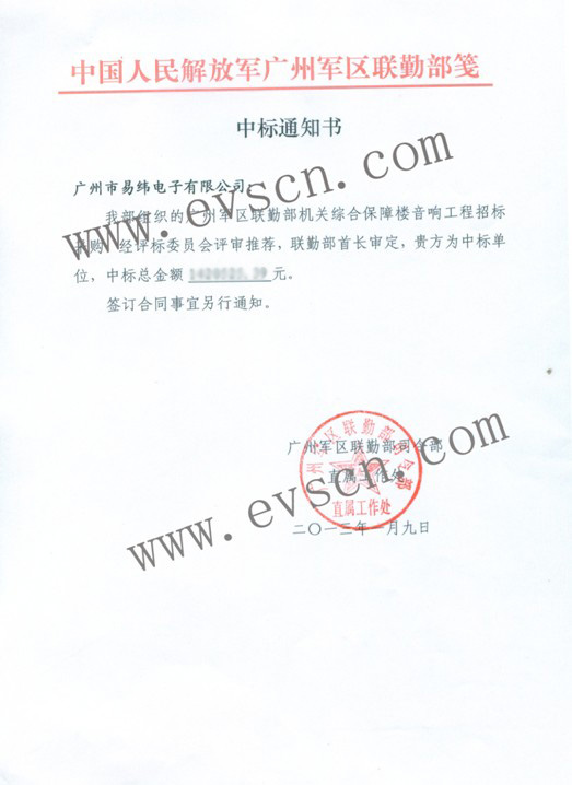 祝贺易纬广州军区联勤部机关综合保障楼音响工程项目中标
