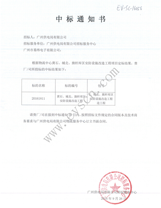 2016年9月26日,易纬电子在众多投标单位以二名的优异成绩,中标物流中心黄石、城北、旗杆库区安防设施改造工程项目中第二组分包项目----城北、旗杆库区安防设施改造工程造工程。此工程地点是物流中心城北、旗杆库区。