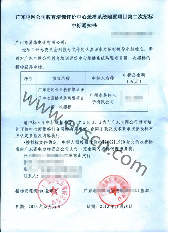 2013年10月28日,广州市易纬电子有限公司经过二次投标,获得广东电网公司教育培训评价中心录播系统中标资格。广东电网公司是中国南方电网有限责任公司的全资子公司,前身为广东省广电集团有限公司,2005年3月31日更名为广东电网公司。2012年1月1日,下辖的广州供电局、深圳供电局正式分立由南方电网公司直管。公司注册资金360亿元。作为规模巨大的公司实体,对于企业内外部的培训成为领导重视的部分。如何有效运用培训资源,并把这种经验有序传递下去,成为此次项目的重点。录播系统既可以详细记录培训或者开会等实况,又可以直播同时满足多地区多主体的沟通使用,正因为此,成为现在大型企业培训中心建设的重要板块。