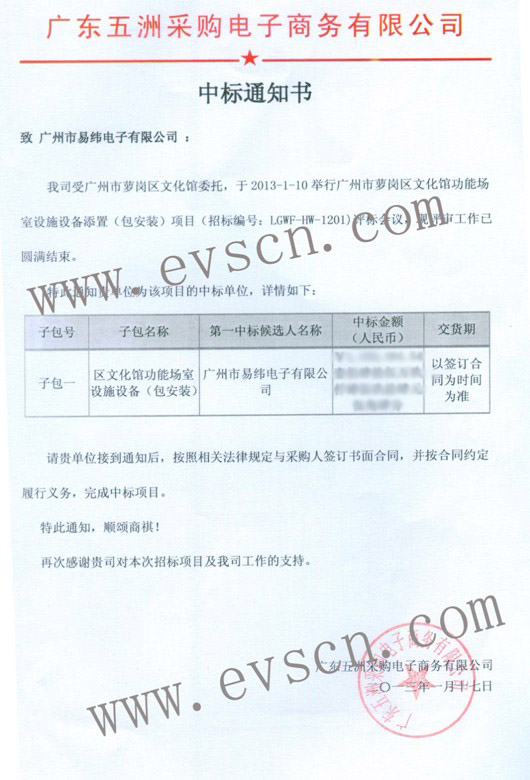 祝贺易纬萝岗区文化馆功能场室设施设备添置中标项目成功中标