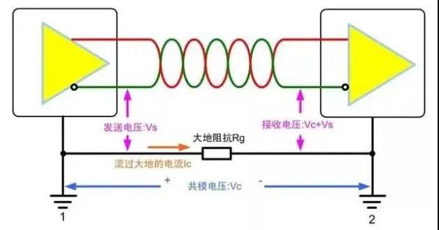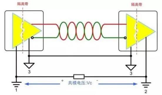 若直接将相距很远的通信节点分别连接至各自的本地大地,地电势差会以共模电压的形式叠加在总线发送器的输出端,叠加之后的信号可能远远超过接收器所能承受的共模输入电压范围,从而无法正常接收信号,严重还会损坏收发器。普通的RS-485收发器的共模输入范围较小,大地流过各种大型设备注入的大电流,由此引起的地电势差可高达几伏、几十伏甚至上百伏,远远超出收发器所能承受的电压范围。
