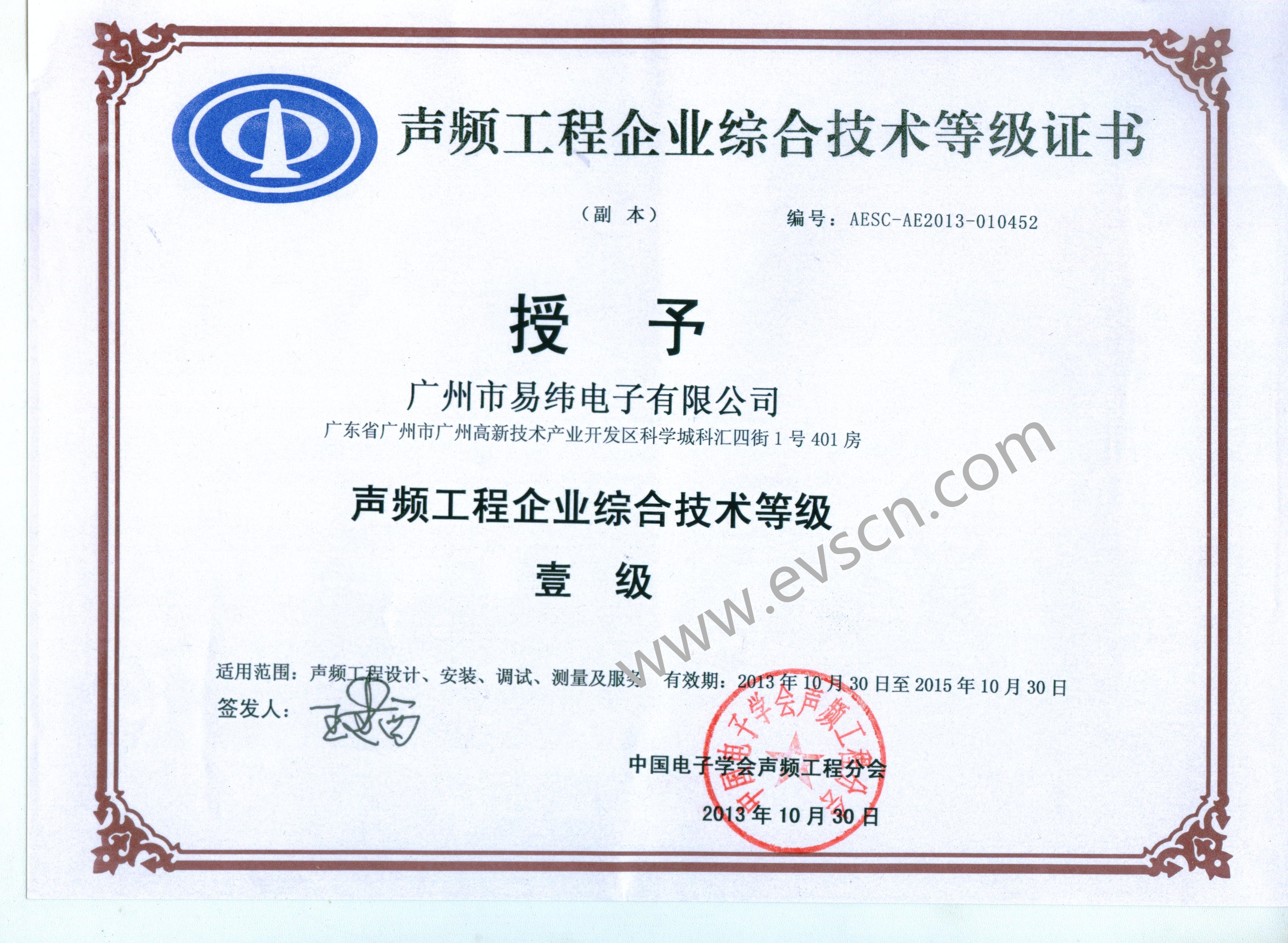 “勇于开拓,锐意进取”是广州市易纬电子有限公司一贯秉承的理念,逐年不断增加的资质已经体现了易纬不断前进的步伐和发展历程。近日,广州市易纬电子有限公司取得中国电子学会声频工程分会颁发的声频工程企业综合技术等级壹级资质。中国电子学会声频工程分会是中国电子科技集团公司第三研究所发起设立并由其单位秘书处的专业机构,其在全国范围内提供学术交流、科学普及、书刊编辑、教育培训、评审鉴定、专业展览、咨询服务,受到业界的普遍认可。