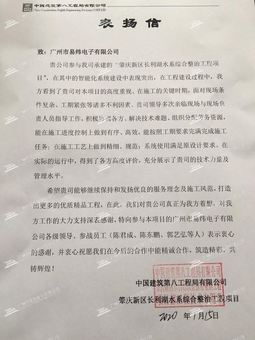 中建八局在感谢信中表扬了广州易纬在施工进度控制、施工工序和工艺、工作配合、系统配置等方面的优秀表现,充分肯定了广州易纬的技术力量和管理水平,并点名表扬了陈君成、陈东鹏、郭艺弘等表现优秀的易纬员工。