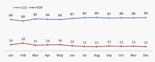2011年,商用液晶拼接屏市场取得不俗的成绩,市场份额节节上升,在商用拼接屏市场占据80%以上的份额,而PDP拼接显示屏的市场份额则一路下滑,2011一直徘徊在20%以下的份额。