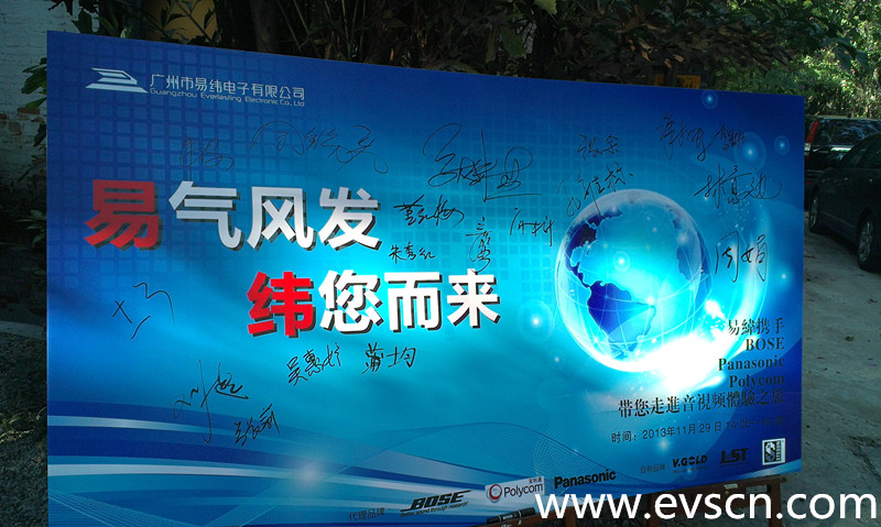 2013年11月29日,由易纬主办的以“易气风发,纬您而来”为主题的产品推广会在羊城创意产业园圆满落幕!易气风发,纬您而来-----由易纬携手BOSE\Panasonic\Polycom带您走进音视频体验之旅”是一场以易纬自有品牌及代理品牌推广为主的活动,主要邀请音视频、灯光音响同行前来参加。