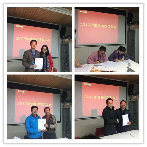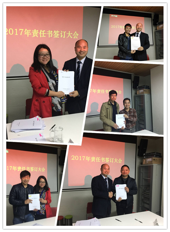 会上,各部门负责人和公司高层共同签订了各部门责任书,责任书内容明确规定了各部门2017年的工作质量目标。副总经理刘冬梅对各部门目标也做了解读,本着“谁主管,谁负责,层层签订”的原则,根据公司组织架构,按照分层管理,分级管理,责任到人的要求,并结合岗位职责,分管领导和部门负责人签订,部门负责人和各岗位员工签订。分别从工作目标、指标要求、考核与奖惩三个方面进行了详细的责任划分。