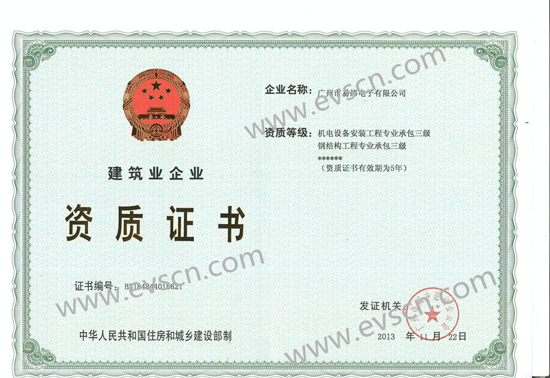 “勇于开拓,锐意进取”是广州市易纬电子有限公司一贯秉承的理念。2013年11月22日,广州市易纬电子有限公司通过全体员工不懈努力及行业良好的口碑,达到广州市城乡建设委员会的各项指标,顺利获得机电设备安装工程专业承包三级、钢结构工程专业承包三级资质证书。此资质的取得使易纬公司行业等级和专业水平又上一个台阶,同时也标志着易纬已跻身于机电设备安装与钢结构建筑安装的先进行列,增强了易纬在同行业中的竞争能力。