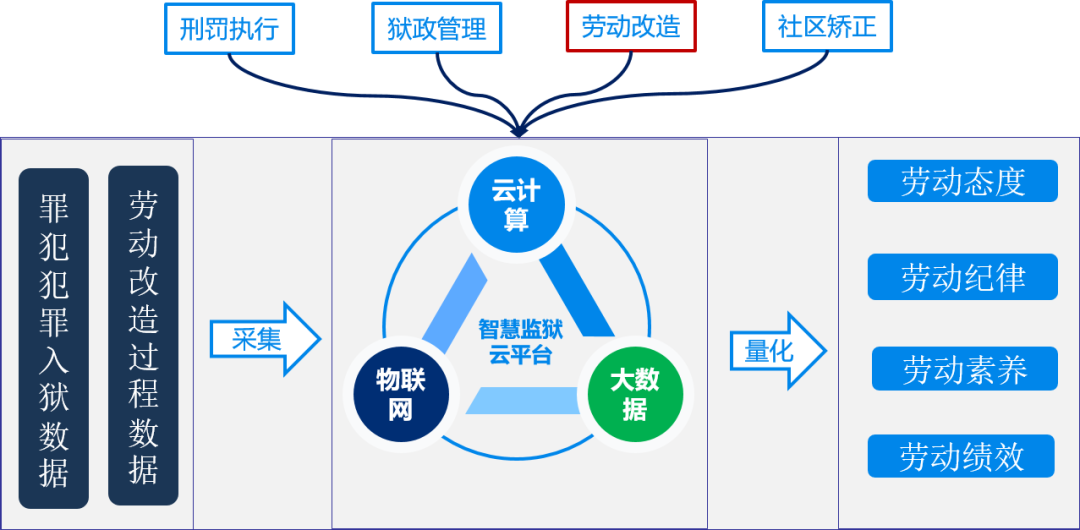 平台以大数据、云计算、物联网等新科技手段的应用为基础,通过自动化采集罪犯劳动改造各种信息数据,经由大数据客观分析评估每名罪犯在劳动态度、劳动纪律、劳动素养、劳动绩效等方面的表现,自动生成罪犯劳动改造效果评估结果,为狱政管理、教育改造、刑罚执行和社区矫正等提供重要依据,为司法部智慧监狱的审核验收评分提供较多的助力。