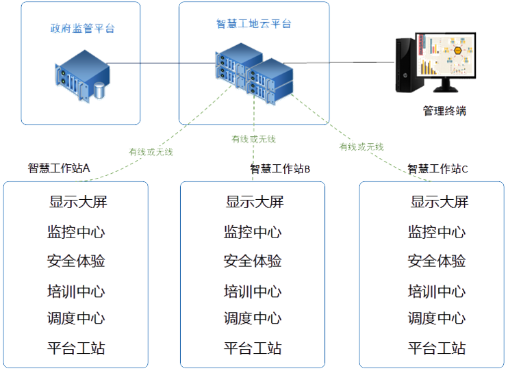 “智慧工地”借助智能头盔,智能马甲、监控系统、人脸识别技术等建设一个智慧云平台,云平台连接着政府监督平台并将信息下发给多个智慧工作站;每个智慧工作站都设有显示大屏、监控中心、安全体检、培训中心、调度中心等,通过充分利用移动互联、物联网、云计算、大数据等新一代信息技术,彻底改变传统建筑施工现场参建各方现场管理的交互方式、工作方式和管理模式,为建设集团、施工企业、政府监管部门、设备运维公司等提供一揽子工地现场项目管理信息化解决方案。