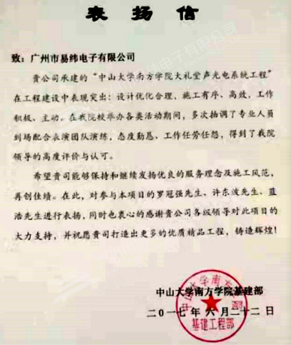 院方在表扬信中说:贵司在工程建设中表现突出,设计优化合理,施工有序、高效,工作积极主动。在我院举办各类活动期间,多次抽调专业人员到场配合表演团队演练,态度勤恳,工作任劳任怨,得到了我院领导的高度评价与认可。